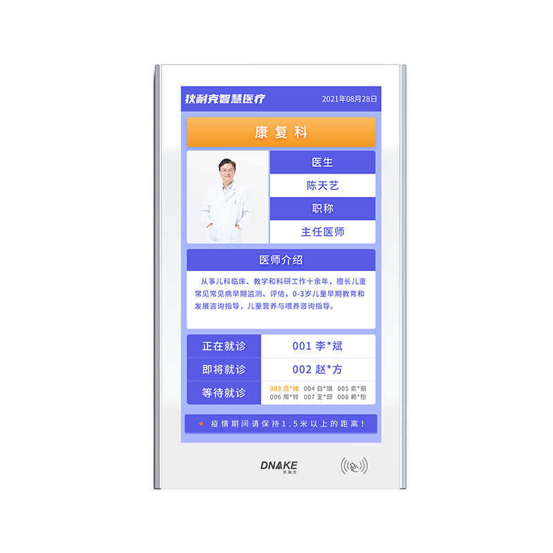 每個診室部署一臺液晶顯示終端,顯示出診專家(出診專科、健康宣教等)信息,診室叫號時全屏(或分屏)顯示需就診患者信息。
