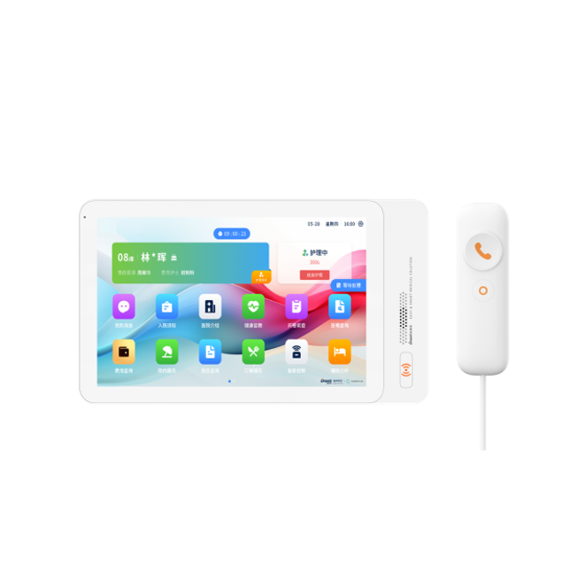 安裝在病床頭的交互設備機,代替?zhèn)鹘y(tǒng)紙質卡。產品支持呼叫對講、為住院患者提供病例查詢、狀態(tài)自動提醒等護理需求等。