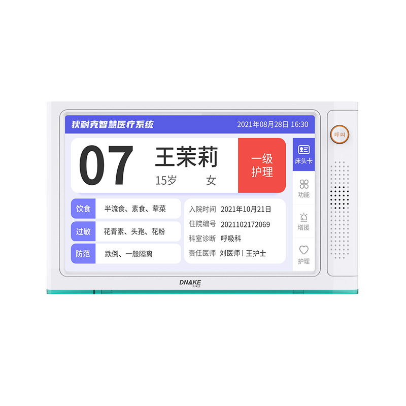 安裝在病床頭的交互設備機,代替?zhèn)鹘y(tǒng)紙質卡。產品支持呼叫對講、為住院患者提供病例查詢、狀態(tài)自動提醒等護理需求等。