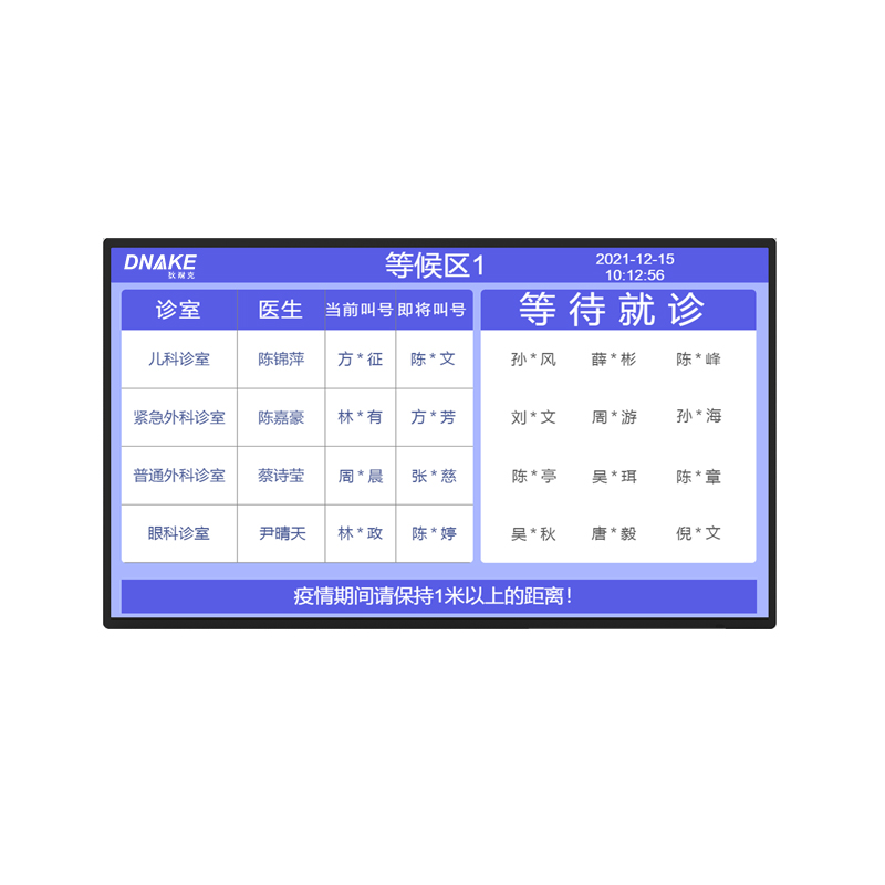安裝在門診等候大廳,用于隨時(shí)得知患者等候科室的叫號(hào)順序,便于患者提前準(zhǔn)備前往科室,緩解患者在等候過(guò)程中的焦慮情緒。