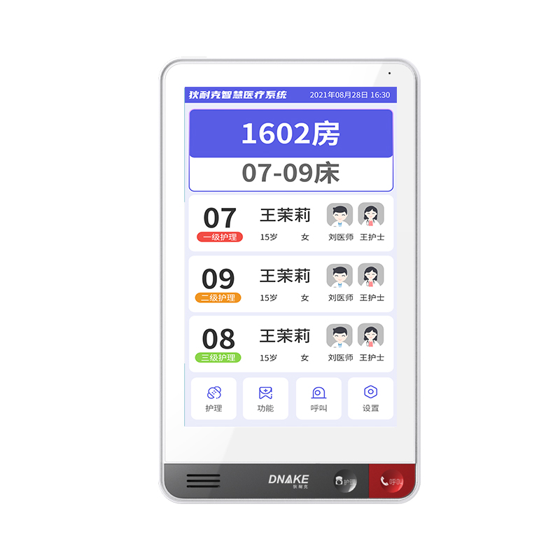 設(shè)置在病房門口的終端設(shè)備,主要用于顯示病房相關(guān)信息,內(nèi)置簡易醫(yī)護(hù)工作站,支持病房床位一覽、患者動(dòng)態(tài)跟蹤、呼叫對(duì)講、增援求救等多種呼叫類型,信息齊全,及時(shí)響應(yīng)醫(yī)護(hù)需求,實(shí)現(xiàn)智能化醫(yī)護(hù)管理。
