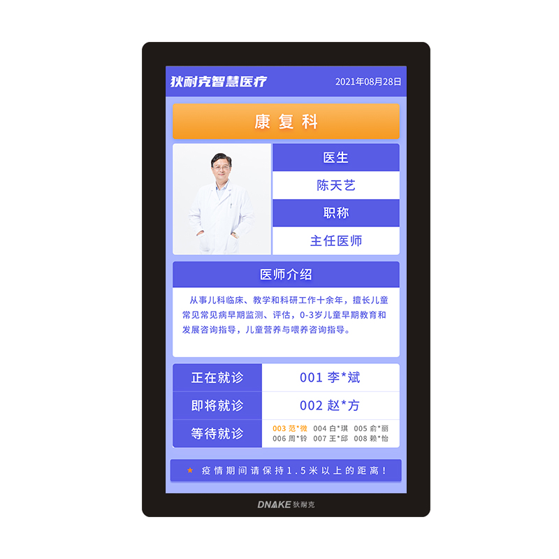 1)可顯示診室醫(yī)生姓名、職稱、照片以及診室號、當前呼叫病人姓名與號碼、當前等待就診病人姓名與號碼;